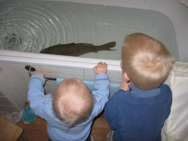 Two youngsters peer into the bathtub at the Christmas carp.